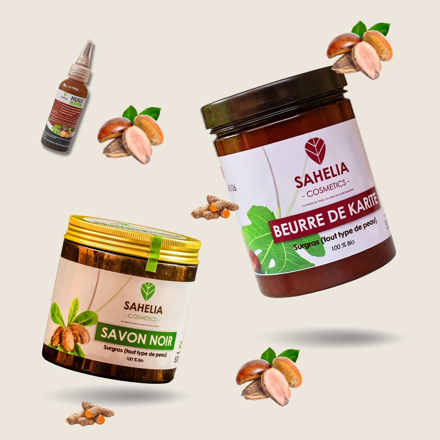 Le Coffret Sahelia est composé d'un Savon Noir Nigelle & Curcuma + du Beurre de Karité au Miel & Une huile de chébé en cadeau. C'est la routine de soin complète pour :